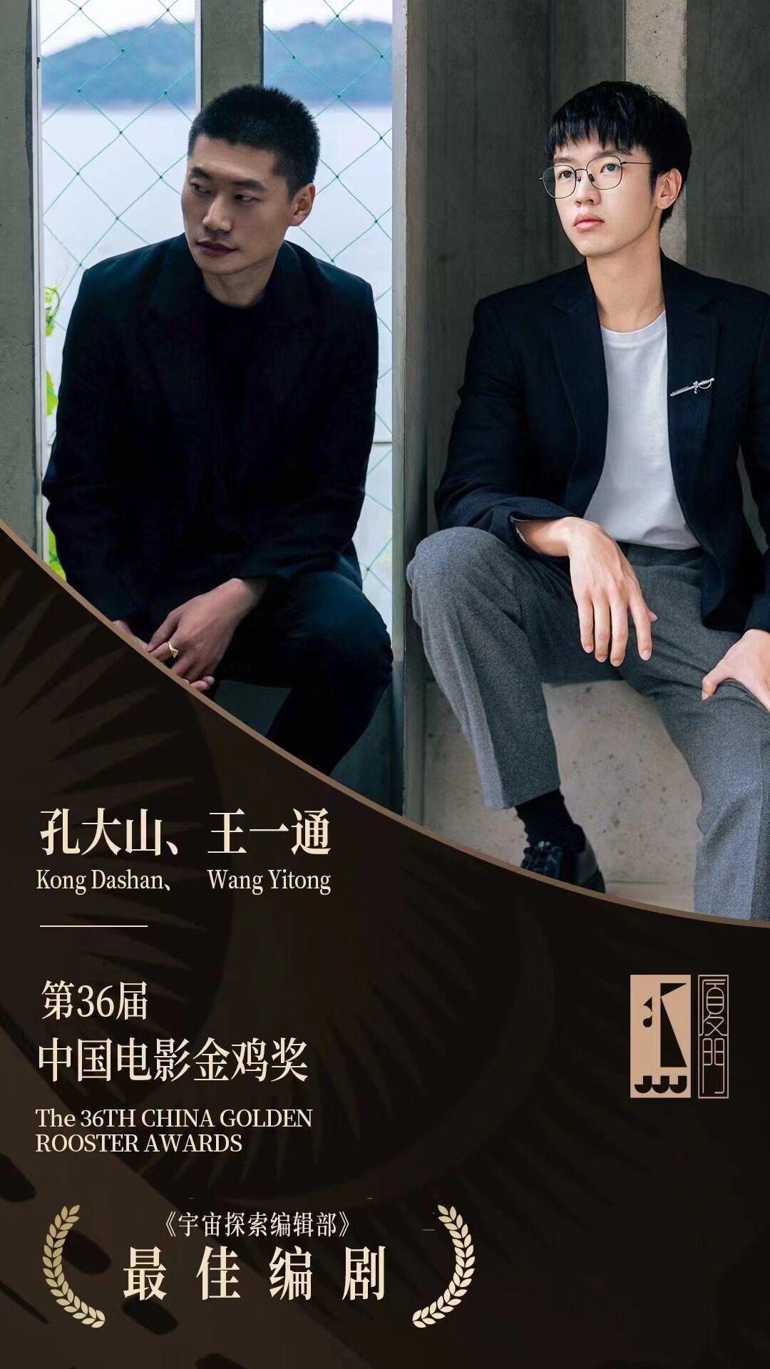 第36届中国电影金鸡奖最佳编剧为孔大山、王一通(凭借《宇宙探索编辑部》获得)。孔大山发表获奖感言时表示:“感谢郭帆导演,十年前在厦门他带领我第一次进电影剧组,言传身教教我怎么拍电影。”王一通表示:“说实话我俩都没有妄想过站在领奖台上,上台的时候,我不停地提醒自己千万不要得意。因为这个瞬间很可能是我职业生涯的高光瞬间,以后大概都走下坡路。开个玩笑,我见到很多更有才华也更努力的同行,我希望有一天他们也有我今天的幸运,能够支撑他们一如既往地相信未来。”