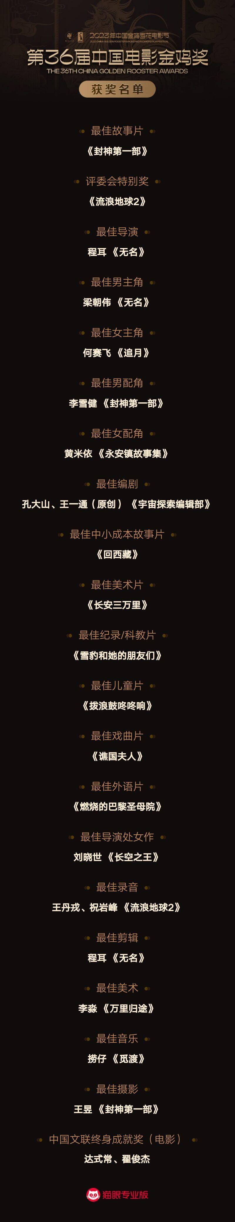 11月4日晚,第36届中国电影金鸡奖颁奖典礼在厦门举行,各大奖项悉数揭晓。《封神第一部》获最佳故事片,程耳凭借《无名》获得最佳导演,《流浪地球2》获得评委会特别奖,孔大山、王一通凭借《宇宙探索编辑部》获最佳编剧。