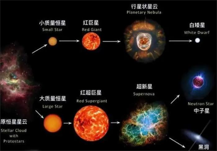 根据目前的恒星演化模型,当恒星接近晚年阶段时,它们会因无法抵抗自身引力而发生大爆炸。根据恒星的质量,它们将有不同的命运。质量较小的恒星可能演变为白矮星,放射出微弱的白光。质量稍大一些的恒星在燃尽燃料后会膨胀成超新星,然后坍缩为中子星。而质量更大的恒星在超新星爆发后,可能会坍缩到一个无法被观测的状态,这就是黑洞的诞生。