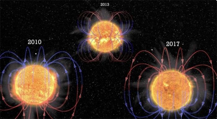 除了表面的刺猬之外,欧空局的“太阳轨道器”还拍摄了太阳南极的照片,并且同样由于太阳等离子体的特性,每到太阳活动的巅峰时期太阳南北极就会发生磁极互换或者反转,从而造成整个太阳磁场的颠倒,这种情况和地球每隔几十万年发生一次的磁场翻转还不一样,属于尚未被破解的恒星物理学难题之一,目前还在研究过程中。