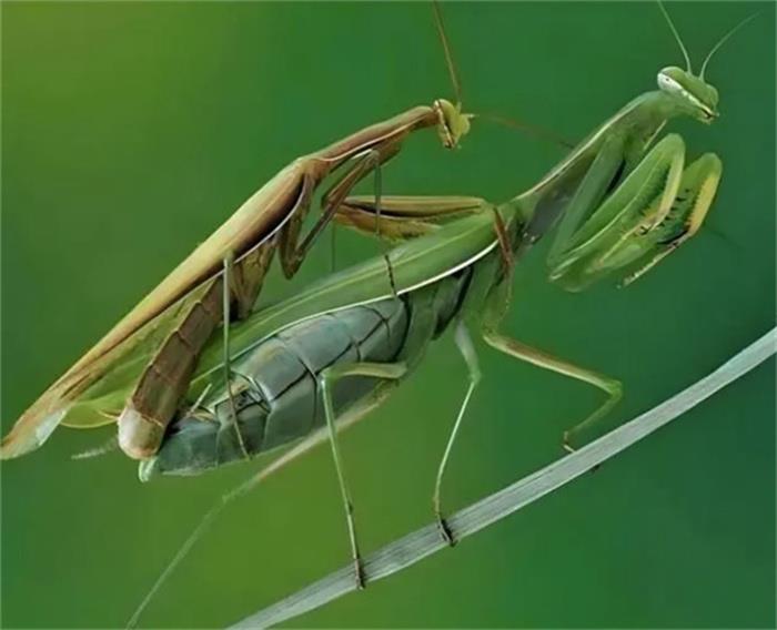 有时候,雌性螳螂会在交配或交配后突然咬断雄性螳螂的头,然后吞食他的身体。这种同类相食的行为被称为“性食同类”,让雌性螳螂获取更多能量和蛋白质,并有助于雄性螳螂的精子更容易地进入雌性螳螂的体内。