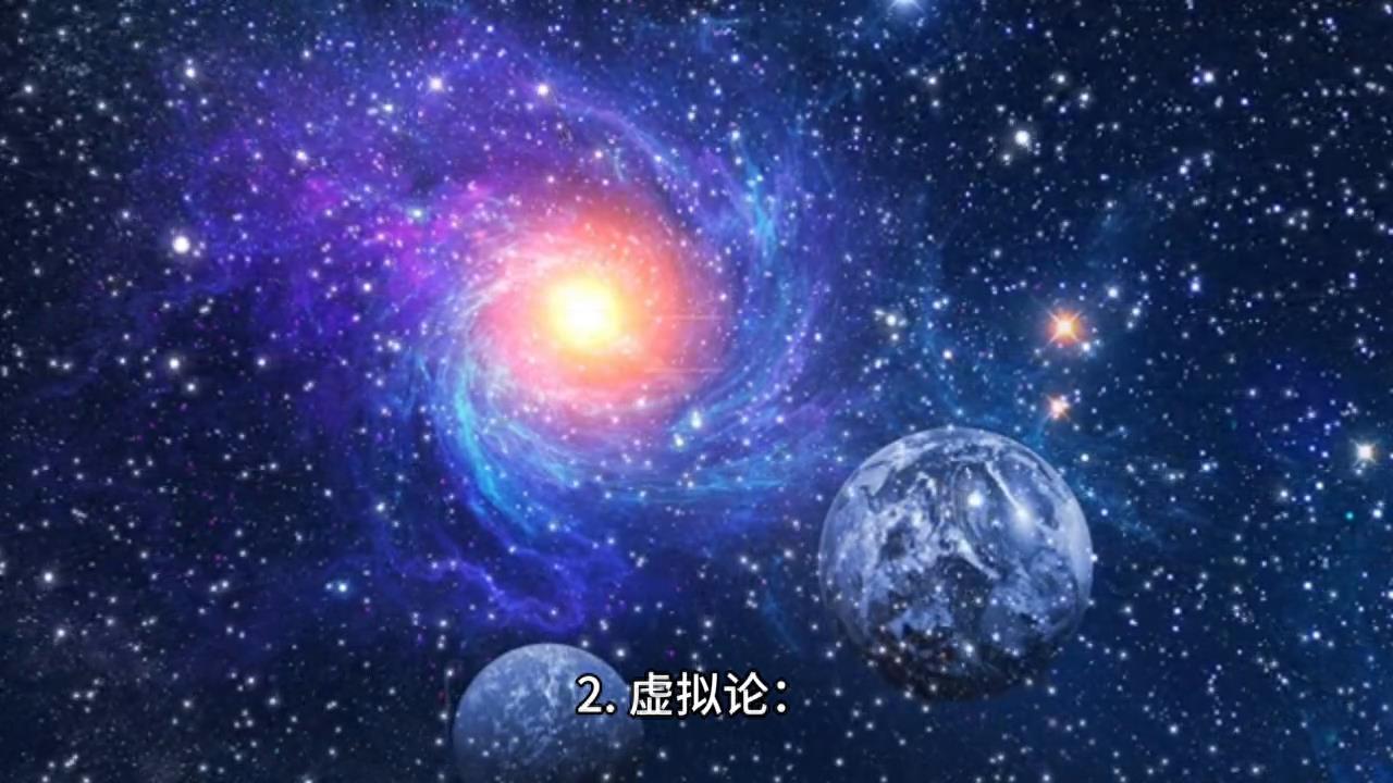 ·2.虚拟论:认为我们所处的宇宙其实是被十分发达的外星人中的某个人编织的一个程序,宇宙之外就是我们的主人,像观看按程序自动生成各种预设场景的游戏一样在看着我们。