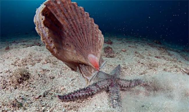 海星,作为扇贝的天敌,经常对它们展开猎杀。海星通过自己的管足和胃部将扇贝的贝壳打开,然后将胃插入扇贝体内进行消化。尽管扇贝可以游泳,但它们的游泳能力并不足以完全逃脱海星的捕食。在一项实验中,科学家们发现,每天平均有三个扇贝会成为海星的猎物,这使得扇贝的生存面临了巨大的挑战。