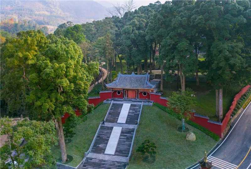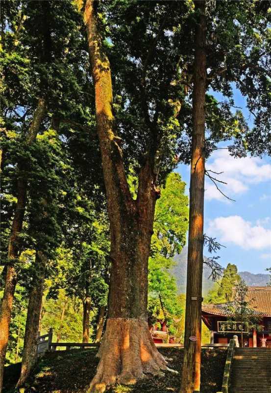 它一旁是另一株树龄相仿的桢楠,被雷电劈开树干后,仍顽强生长,两棵大树后是千年古刹云峰寺。