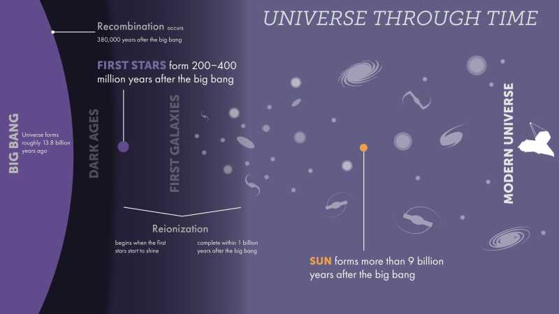 宇宙大爆炸后的几亿年,也就是所谓的"重离子时代"(Era of Reionization),当时的宇宙与现在截然不同。(恒星和星系之间的气体在很大程度上是不透明的。整个宇宙的气体直到宇宙大爆炸后 10 亿年左右才变得完全透明。星系中的恒星对其周围的气体进行加热和电离,使气体最终变得完全透明。)