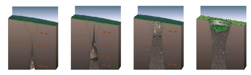 这四张连续的图像显示了夏威夷火山塌陷形成的方式。随着火山喷发和沉降,裂缝形成。它们慢慢地向上迁移,上面的岩石开始落入其中。最终,向上迁移的裂缝到达地表,屋顶塌陷。在地球上,植物最终会在陨石坑中定居,在火星上,它们与坍塌时大致相同。
