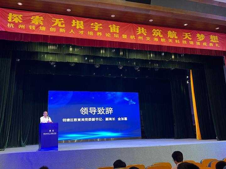 钱塘区教育局党委副书记、副局长金加喜发表致辞。他介绍了办好航天教育,钱塘优厚的基础支撑、领先的团队引领和扎实的实践探索,并表示钱塘将以本次活动为契机,持续提升航天教育实绩实效,努力争创科学教育先行区、样本区,全面打响“钱塘优学”金名片。
