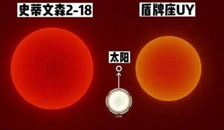 盾牌座UY位于盾牌座,是一颗红超巨星,它的半径是太阳的1708倍,体积相当于51个太阳,体积之大,令人乍舌。如果把盾牌座UY放到太阳系的中心,它的边缘可以接近土星的轨道,可见其体积的巨大。