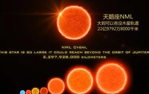 天鹅座NML是一颗位于天鹅座的红特超巨星,这颗星球的体积相当的巨大,它的光速绕其一圈所需要的时间大约是6小时零40分。天鹅座NML还在不断的膨胀,目前已经膨胀到太阳半径的1605倍,在宇宙当中是目前人类已知的最大的星体之一。
