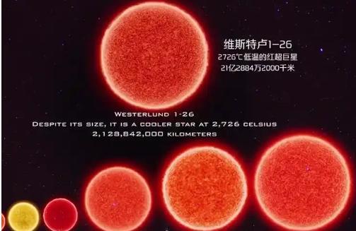 维斯特卢1-26位于超星团维斯特卢内,是一颗红特超巨星。它的半径相当于1530倍的太阳半径,如果把这颗星球放在太阳的位置上,它的光球层可以把木星的轨道吞没。