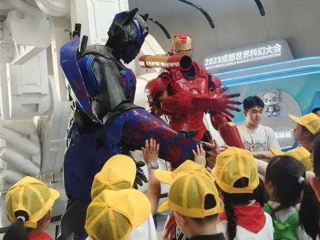 在机器人互动环节。青少年们与炫酷的擎天柱和钢铁侠近距离接触,交流、握手。这一环节不仅让大家感受到了人工智能的魅力,也激发了他们对机器人技术的浓厚兴趣。