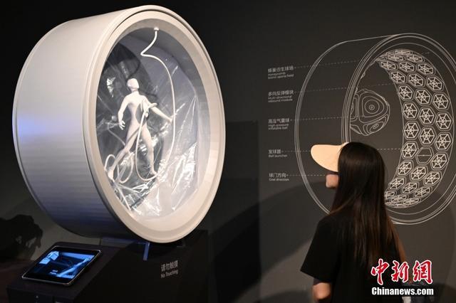 7月2日,由中国国家博物馆、瑞士驻华大使馆、瑞士洛桑联邦理工学院主办,清华大学天文系、清华大学美术学院协办的“宇宙考古:时空探索”展览在北京中国国家博物馆开展。展览分为“仪器和技术:绘制宇宙”“大数据的星空”“可持续的太空”“未来:行星之旅”四个部分,融科学探索和艺术诠释为一体,将宇宙中真实、分散、抽象的数据,通过数字装置、互动体验、动态雕塑和前瞻性设计等多种形式呈现出来。图为参观者观看来自清华大学美术学院的实验装置《澡 AQUA》,该实验探讨了在太空如何实现自我清洁沐浴体验。 中新社记者 田雨昊 摄