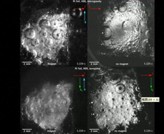 图:重力和微重力条件下,有磁铁与无磁铁的铂箔上电催化析氢反应演示。源:美国佐治亚理工学院/德国不来梅大学