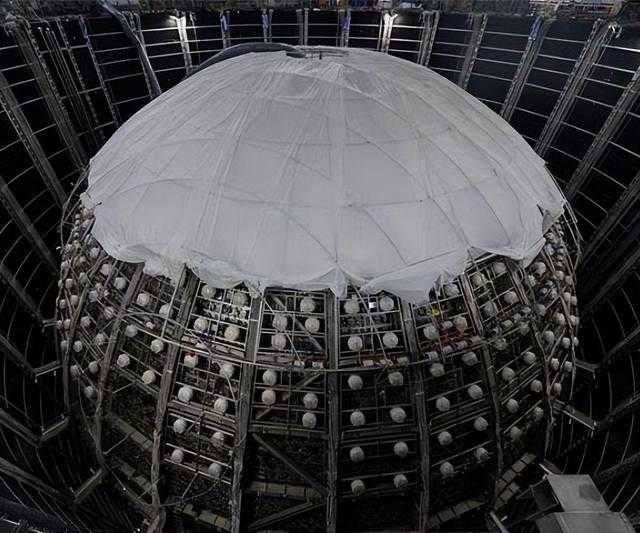 JUNO 的核心探测装置堪称现代工程学的巅峰之作。这个悬浮在 44 米深水池中央的 "科学巨眼",由直径 41.1 米的不锈钢网壳支撑着世界最大的单体有机玻璃球,球内灌满 2 万吨液体闪烁体,周围环绕着 45000 只光电倍增管 —— 相当于每平方米布置 1.5 只 "眼睛",将闪烁光的探测效率提升至 78% 的历史新高。更令人惊叹的是,这个按比例薄如鸡蛋壳的有机玻璃球(直径 35.4 米却仅 12 厘米厚),需要长期承受 3000 吨的浮力,工程团队通过特殊设计的不锈钢节点和碟簧结构,将受力误差控制在微米级别。