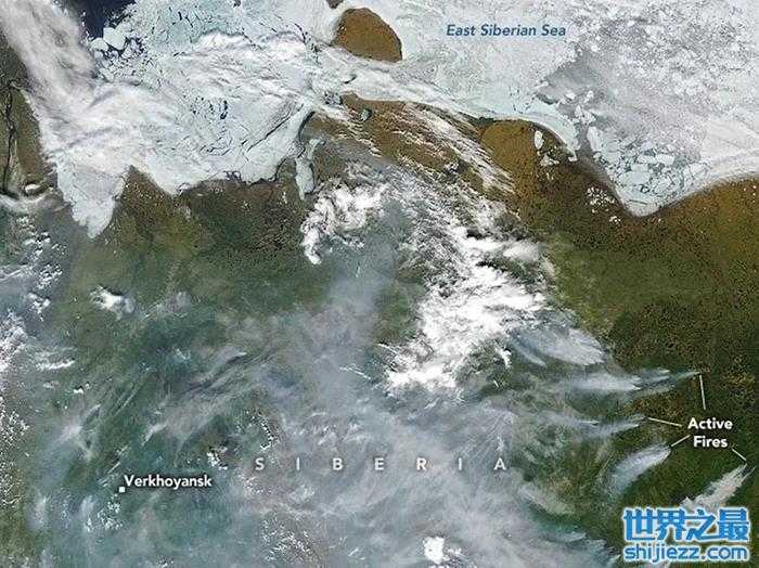 图为NASA提供在西伯利亚城镇维尔霍扬斯克附近大火弥漫烟雾的卫星图。
