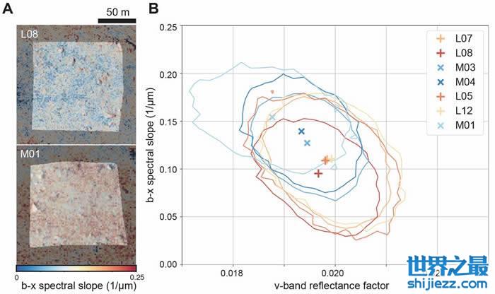 Sei-Ichiro Watanabe和同事首次展示了对龙宫质量、形状和地形学所做的近距离观察。据Watanabe等披露,该小行星的低密度和高度多孔的内部表明,它是松散集合的“一堆碎石”,后者会在快速旋转期形成陀螺形状。此外,作者还发现了最适合该航天器采集样本的潜在着陆地点。Kohei Kitazato和同事用隼鸟2号上的近红外光谱仪(NIRS3)来勘测龙宫的表面组成;他们发现,在该暗黑色小行星的整个表面遍布着水合矿物。先前对龙宫表面所进行的望远镜分析曾提示该小行星的含碳性质,而碳质球粒陨石显示有被水改变化学迹象的碳质球粒陨石也被认为有类似的组成。然而,详细光谱数据的匮乏令确定性组成识别变得困难。在隼鸟2号接近龙宫时,作者采集了NIRS3光谱数据,这些检测数据的采集高度距离该小行星表面近至1公里。