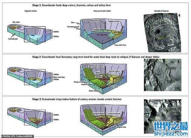 塞勒斯团队对位于火星北半球地表下的24个封闭陨石坑进行研究,发现了只有水存在才能形成的特征,包括蚀刻在陨石坑壁上的通道、地下水枯竭形成的河谷、被认为随着水位的上升和下降而形成的黑暗且弯曲的三角洲、由积水形成的陨石坑壁内的山脊状梯田,以及与流水相关的扇形沉积物等。所有特征都出现在地下4000到4500米深处,表明这些陨石坑曾包含随时间推移而变化和消退的水池和水流。