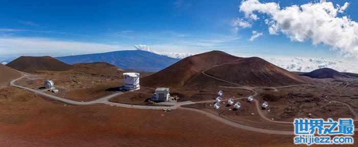 在夏威夷茂纳开亚火山(Mauna Kea volcano)上矗立着许多天文台,其中也包括在2017年参与事件视界望远镜观测的詹姆斯.克拉克.麦克斯威尔望远镜(左二)。 PHOTOGRAPH BY BABAK TAFRESHI
