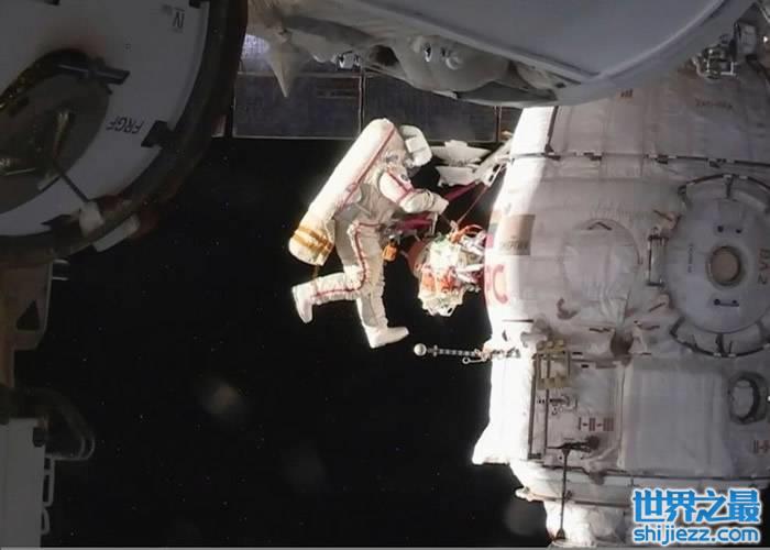 宇航员在宇宙空间漫步,为空间站进行维修。