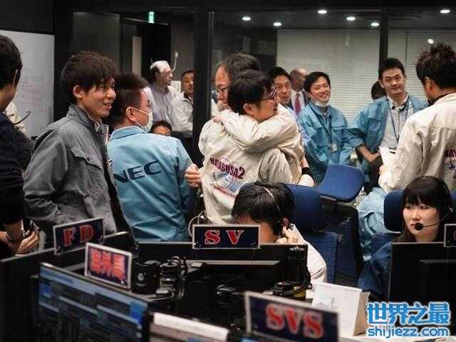 JAXA人员获悉探测器成功降落后,兴奋得互相拥抱。
