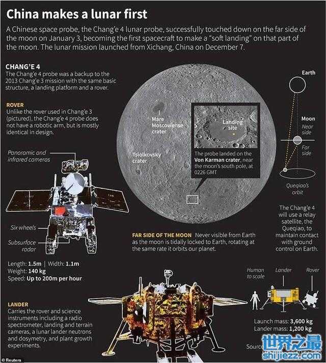 「嫦娥四号」探测器3日成功着陆在月球背面东经177.6度、南纬45.5度附近的预选着陆区,并透过「鹊桥」中继星传回世界第一张近距离拍摄的月背影像图。此次任务实现了人类探测器首次月背软着陆,首次月背与地球的中继通信,开启了人类对月球探测的新研究。
