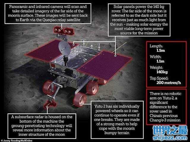 照片显示,玉兔二号仍然位于4日到达的「A点」位置,面前是一个坑。玉兔二号1月3日晚间与着陆器分离,踏上月球表面,其后进入「午休」。玉兔二号巡视器10日零点完成出月午设置,恢复工作。