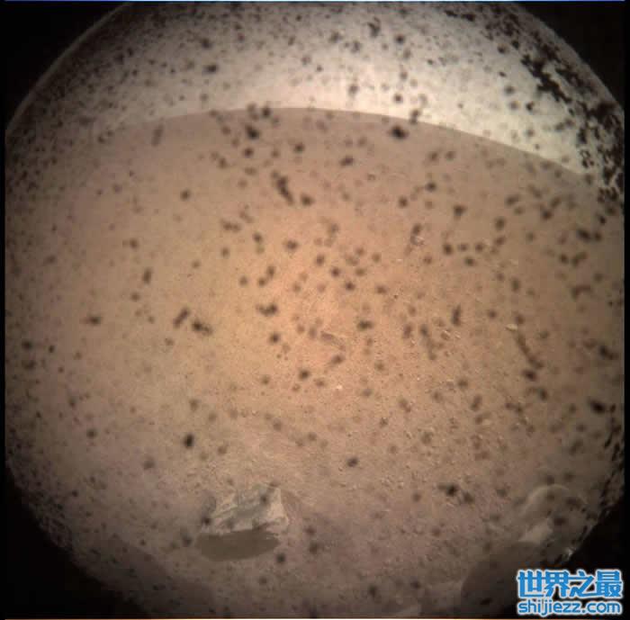 登陆活动从3:44分正式开始,NASA也在推特进行全程直播,最终洞察号于3:53分成功着陆在火星预定着陆点。照片也是在4:03分拍摄完成的。从照片上可以看到,一条弧形的天际线在远处延展开来,可以清楚地分辨火星的地面与天空。至于照片上的黑色斑点,则是由于照相机表面的防尘盖尚未打开,尘土粘附在表面导致的。
