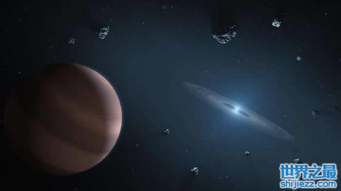 艺术示意图,围绕白矮星运行的一颗系外行星,白矮星周围包裹着一个残骸物质构成的盘状物