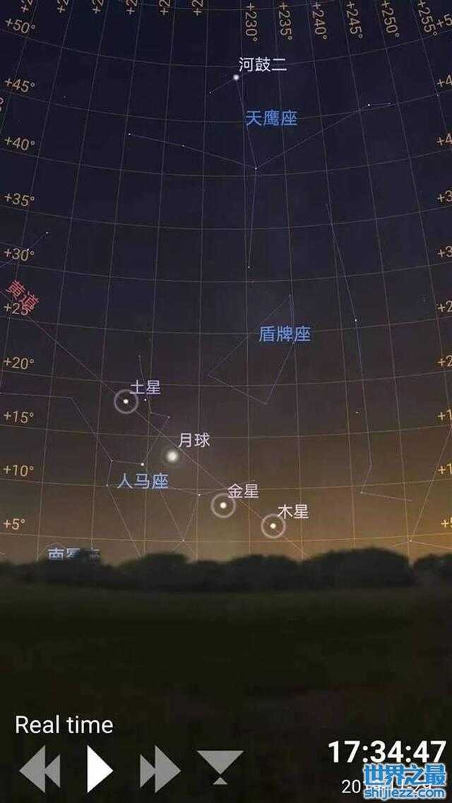 需要注意的是,虽然这4颗天体都很明亮,但是我们从模拟星空中可以看出,它们在日落1小时后地平高度都很低了,最高的土星有18°,而最低的木星就只有约6°。
