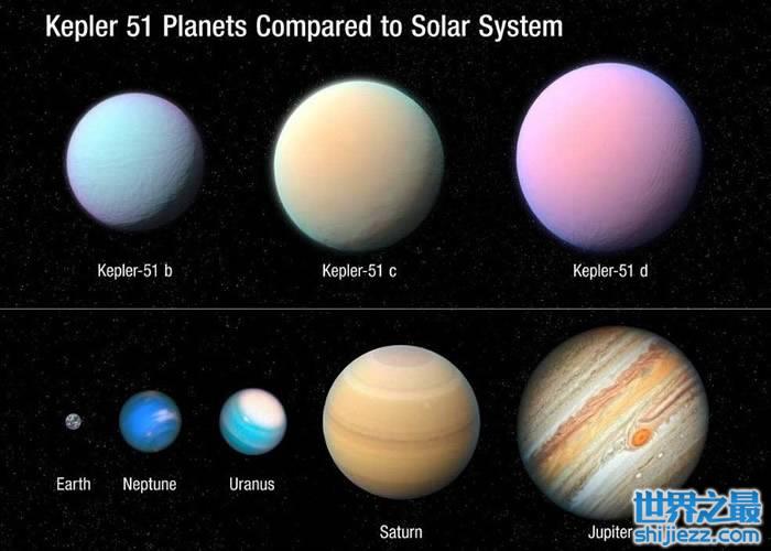 该3颗棉花糖行星距地球约2600光年,围绕一颗类似太阳、名为“开普勒51”的恒星运行,有木星那么大的它们只有5亿年历史,远比太阳的46亿年历史短,质量却比木星轻100倍,不同于太阳系中存在的任何东西。NASA在2014年确定这些年轻行星具低密度大气层。