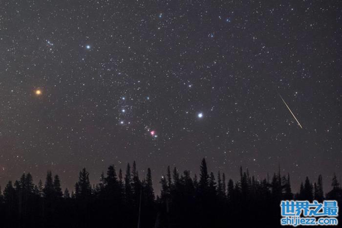 一颗流星划过地平在线空的猎户座。明亮的红巨星参宿四(左)就位在这个著名的星座之中。 PHOTOGRAPH BY BABAK TAFRESHI, NAT GEO IMAGE COLLECTION