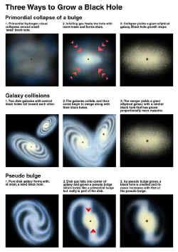 黑洞的产生过程类似于中子星的产生过程;恒星的核心在自身重力的作用下迅速地收缩,塌陷,发生强力爆炸。当核心中所有的物质都变成中子时收缩过程立即停止,被压缩成一个密实的星体,同时也压缩了内部的空间和时间。但在黑洞[3]情况下,由于恒星核心的质量大到使收缩过程无休止地进行下去,中子本身在挤压引力自身的吸引下被碾为粉末,剩下来的是一个密度高到难以想象的物质。由于高质量而产生的力量,使得任何靠近它的物体都会被它吸进去。黑洞开始吞噬恒星的外壳,但黑洞并不能吞噬如此多的物质,黑洞会释放一部分物质,射出两道纯能量——伽马射线。