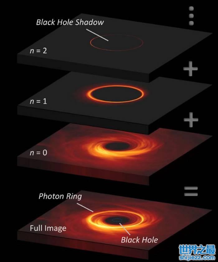 通过计算机软件模拟出高精度的黑洞图像,分解为一层层的子图像,哈佛-史密森天体物理学中心的研究人员发现了理论与现实照片的吻合性。他们认为,根据黑洞层层光环的大小和形状,科学家们有望计算出黑洞的质量和自旋性质。