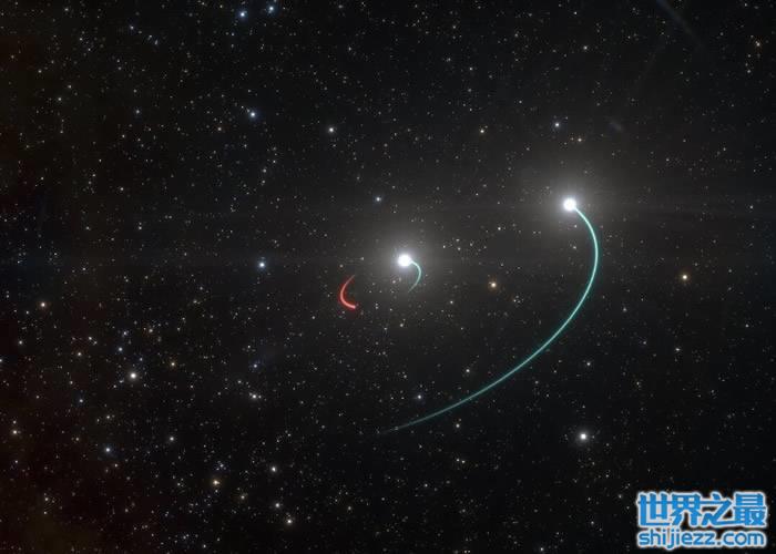 伴星(蓝色轨迹)围绕黑洞(红色轨迹)旋转。