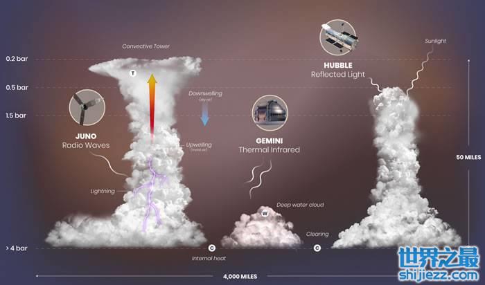 通过将这三方面的信息结合起来,研究小组发现,雷击,以及产生雷击的风暴系统,都是在深层云层上大型对流单元及其周围形成的。最有攻击性的闪电是从一个被称为“丝状气旋”的漩涡中观察到的,哈勃和双子座的图像可以俯视到这个漩涡。那原来是由高大的对流云组成的扭曲集合。深层的缝隙揭示了远在下面的水云,通过各种波长的观测,可以建立气旋的三维模型。