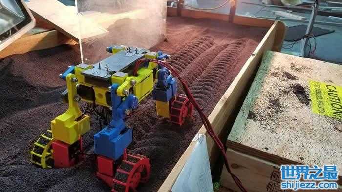 在这个过程中,机器人利用前轮搅动材料、将种子推回到后轮上、后轮再左右摆动然后抬起并旋转--就像在水中划桨一样。这样做得到的效果是改变了后轮前面的坡度,使其更容易攀爬。