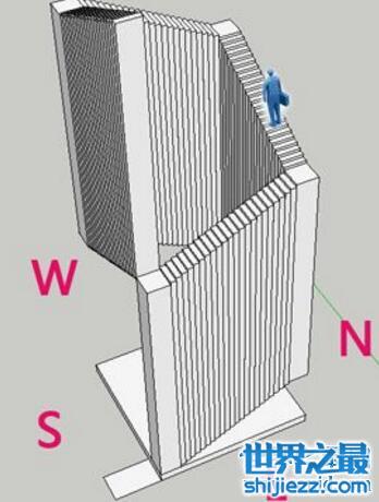 总共往上斜了23厘米,减掉落差17厘米,实际上人是往上走了6厘米,再换到西面,还是往上斜1厘米,走完23阶实际上又往上走了6厘米,加起来就是12厘米,再转到北面,前22阶楼梯都往上斜一厘米,最后一阶直接落在起点上,因为起点是平的,那么实际上这一段只斜上去22-17等于5厘米,加上前面的6+6的总和12厘米正好又是17厘米,如此循环下去,永远走不完。