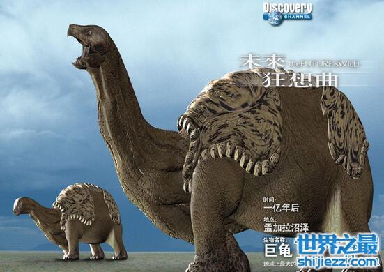 这是地球上有史以来最巨大的生物,也是古老的龟家族中最后一位成员,体积甚至比最大型的恐龙还要庞大。重约120吨的巨龟,比大象要重上24倍,站起来则有7公尺高,是一般人的4倍高。巨龟有丰富的植物可供摄食,每天可获取590公斤的营养。它具有特殊的消化系统,胃部肌肉发达,专门设计来碾碎食物;肠子里则充满细菌,可以消化剩下来的花草大餐。