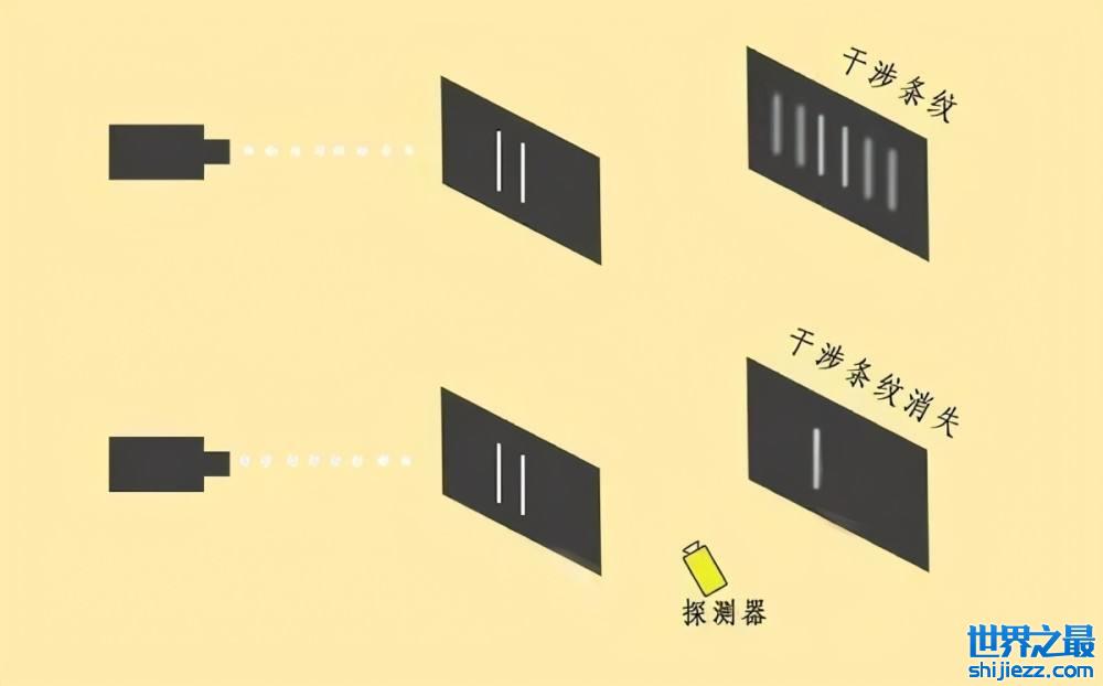 奇怪的事情发生了,当科学家用探测器进行观测时,电子乖乖地一个一个通过狭缝,并没有同时穿过两条狭缝,而屏幕上的干涉条纹也消失了。