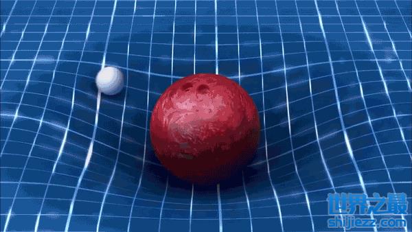 任何有质量的物体都会影响周围的时空,造成时空的压缩,拉扯。就像弹性布料那样(实际上用弹性布料诠释时空压缩并不严谨,只是为了简单通俗)。当有物体在被压缩的时空周围出现时,就会沿着压缩的时空运动。如下图: