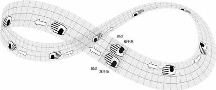 这么剪下去永无止境,最后圈圈套圈圈复杂得可以把你搞疯掉。你是不是很有冲动去试试看了?别忙,还有更有意思的特性。首先来跟我认识一下所谓自然界中的「左右手系」对称。想一下左右两只手套,这两只手套你怎么看它都像是对称的,但问题是,如果你不把手套在空间中翻一个面的话,你永远也无法把两只左右手套完全重合地上下叠在一起,就好像你怎么也不能把左手套在不翻过一面的情况下戴进自己的右手中。不过,如果你让一只左手套沿着莫比乌斯带转刚好一圈(不是两圈),这只手套就会翻过一面成为一只右手套,但是请千万记住它的神奇之处就在于:如果手套有感觉的话,它根本不会发现自己其实被翻过了一个面,在它的感觉中,它只是沿着一个面不停地运动,不知怎么的就从左手系变成了右手系,再运动一圈又变回了左手系。真是要命的感觉。