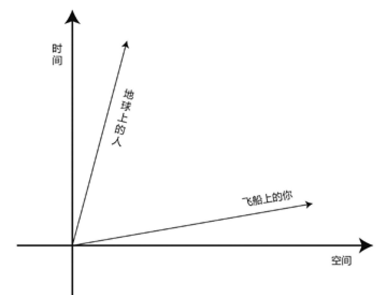 在这张图中,大家都以奥丁星为参照物,地球上的人在时间中运动得很快(接近光速),但是在空间中运动得很慢;而星际飞船上的你则恰恰相反,你在时间中运动得很慢,但是在空间中运动得飞快(接近光速)。所以,以你自己的感觉,你没有用多少时间就从地球飞过来了,但与此同时,地球上的时间却在飞速流逝。