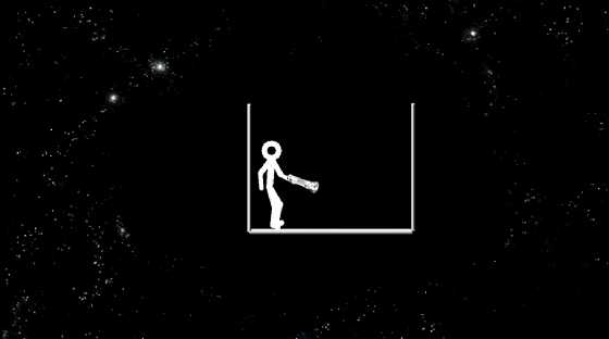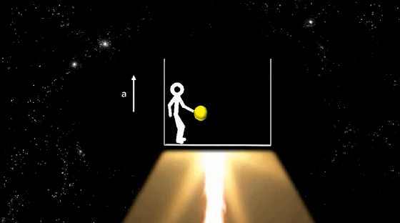 那么现在我们把地球去掉,把这个集装箱置身于宇宙深空,不过这个集装箱在宇宙深空中,以与地面同样的重力加速度9.8m/s²垂直于集装箱底部向上飞行,那么站在集装箱内部的人拿了一个小球,当然这个人是能感受到小球的质量的。如果释放了小球,他会看到这个小球自由落体般的下落到电梯的底部。如果这个人不朝外面看,他压根就无法区分自己是站在地面上还是在宇宙深空中以9.8m/s²的加速度运动。在这里我们可以肯定的说,地球对人类的引力作用就等效于这个人在集装箱内部并在宇宙深空以9.8m/s²加速度飞行。上段已经叙述了!