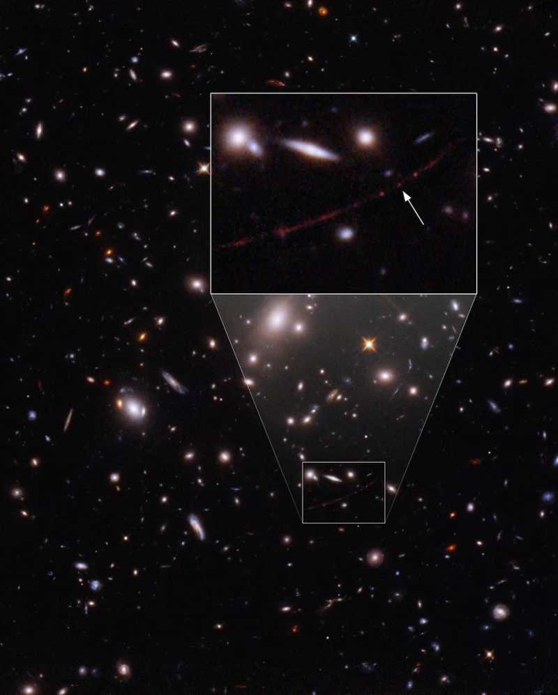 在上图中箭头末端的红点是“埃伦德尔”,是一颗130亿岁的恒星。它是已知最古老的恒星,并被哈勃太空望远镜观测到。它是通过引力透镜效应被发现了,这将继续为揭示宇宙中最早的光提供更多的线索。