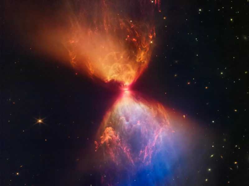 在这张令人惊叹的照片中,光线以沙漏形状从距离地球约460光年的暗星云L1527中爆发出来。韦布望远镜小组在11月发布了这张照片,沙漏形状的核心是一颗原恒星,被一条细细的水平线隐藏着。