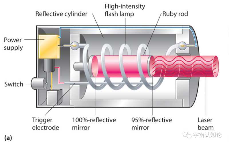 光的量子性质的一个有趣的应用是激光。你可以了解激光的工作原理,但我们将在这里介绍一些关键概念。激光是“受激辐射的光放大”的缩写,是描述光子波长相同、波峰和波谷同相的光的一种语言。在1960年,研究物理学家西奥多·迈曼(Theodore H.Maiman)研制出世界上第一台工作激光器:红宝石激光器。红宝石激光器包括红宝石晶体、石英闪光管、反射镜和电源。