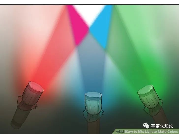 你可以用三个手电筒和三种不同颜色的玻璃纸做一个类似的实验——红色、绿色和蓝色(通常称为RGB)。用一到两层红色玻璃纸覆盖一个手电筒,并用橡皮筋固定玻璃纸(不要用太多层,否则会挡住手电筒的光线)。用蓝色玻璃纸覆盖另一个手电筒,用绿色玻璃纸覆盖第三个手电筒。进入一个黑暗的房间,打开手电筒,把它们照在墙上,使光线重叠,如图所示。