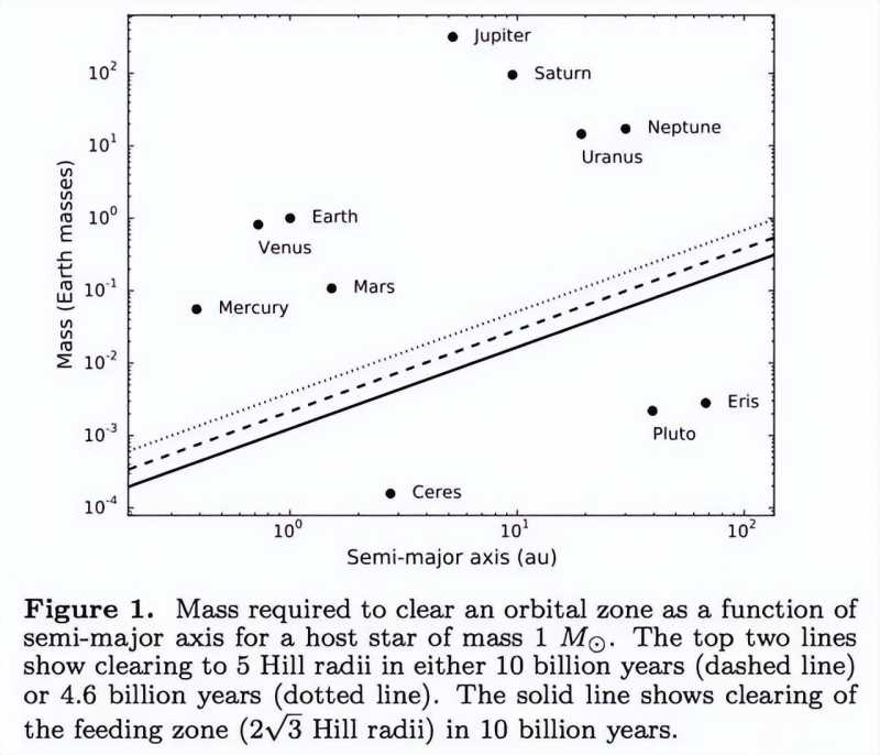 很显然,太阳系中的八大行星都符合,而小行星以及柯伊伯带上的天体就不符合。有趣的是,如果绕太阳公转的只有月球,而不是地-月系统,那么月球将刚好在行星与非行星之间的边界上徘徊。