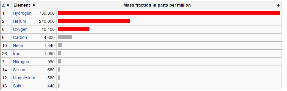 除了氢和氧,宇宙中其他含量较高的元素包括:氦,碳,氖,铁,氮,硅,镁和硫。下图是银河系中主要化学元素的丰度(单位是百万分之一)。