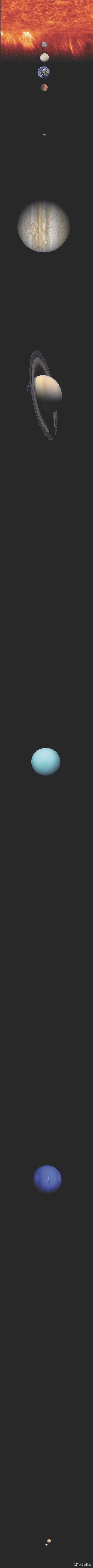 再离远点,看看地球跟太阳的比例,相差130万倍。不看不知道,一看吓一跳!